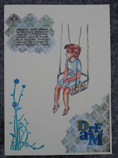 When I read about the Van Gogh contest on Starving artistamps blog, I looked at my stamp collection and thought who could benefit from an Impressionist setting? So here is Sasha running along the sparkling sea. I used watercolour and acrylic over the stamped image, and added Archaic designer brads, which remind me of pieces of polished glass you find on the beach.
