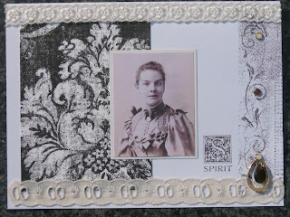 For the challenge card I used 3 different stamps: two from Tim Holtz collection (for the background in black and brown) and a little Spirit stamp (company??). I also dipped a piece of lace in coffee to make it look older than it is. Brads are BG Archaic. The little charm is actually an earring from Sainsbury's. As a magpie I was attracted to its shiny stone, even if I don't wear earrings, but I knew they'd come useful one day. :)